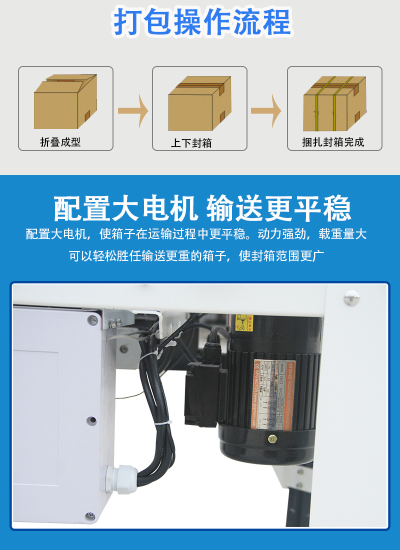 - 該機器具備較高的自動化程度,一旦啟動,除了放置和取出紙箱外,幾乎不需要人工干預。并且,一些先進的一字封箱打包機還具有智能化的特點,如自動檢測紙箱尺寸、自動調整參數、故障自動診斷和報警等功能。這些智能化操作使得設備更加人性化,降低了操作人員的工作強度,同時也提高了設備的可靠性和穩定性。