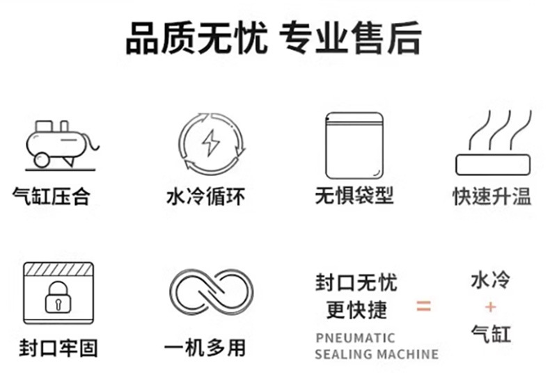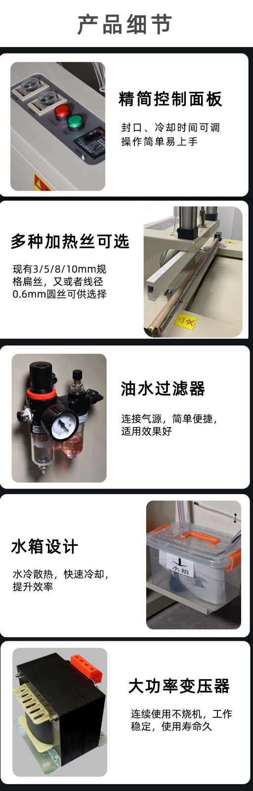 - 持續工作耐力超群:水冷系統有效驅散設備運行產生的熱量,讓機器擺脫過熱困擾,可長時間維持穩定性能,不間斷作業。面對電商大促、工廠趕工高峰,能與高速生產線同頻共振,持續輸出高質量封口服務,不拖生產后腿。