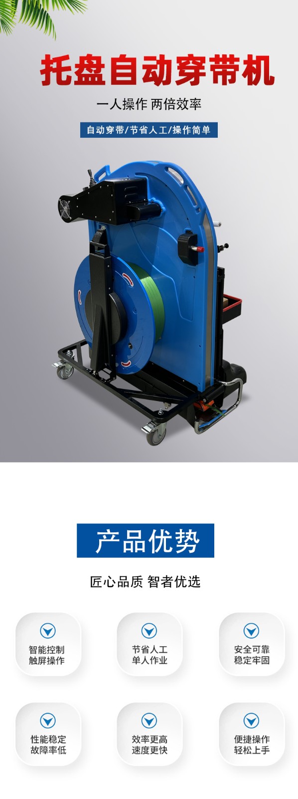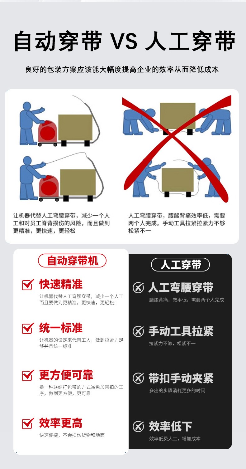 相比人工捆扎(單道耗時 30-60 秒),自動托盤穿帶打包機的核心優勢體現在三個維度: