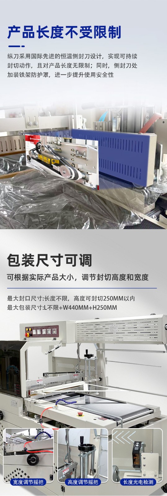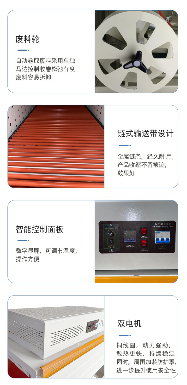 全自動邊封熱收縮機的控制系統是整個設備的 “大腦”,它負責協調和控制各個部件的運行,以實現高效、精準的包裝過程。以下是對其控制系統的詳細介紹: 硬件組成 PLC 控制器 核心運算與控制:PLC(可編程邏輯控制器)是控制系統的核心部件。它接收來自各個傳感器的信號,如產品到位傳感器、薄膜檢測傳感器等,根據預設的程序進行邏輯運算和處理,并向各個執行元件發送控制指令,如驅動電機、氣動元件等,以精確控制送料、套膜、封切和熱收縮等各個包裝工序的執行順序和時間。 穩定性與可靠性:具有高可靠性,能在惡劣的工業環境下穩定工作,抗干擾能力強,可確保設備長時間連續運行而不出現故障,保證包裝過程的穩定性和一致性。 觸摸屏 人機交互界面:觸摸屏作為人機交互的窗口,為操作人員提供了直觀、便捷的操作平臺。操作人員可以通過觸摸屏幕輕松設置各種包裝參數,如封切時間、收縮溫度、輸送速度等。同時,觸摸屏還能實時顯示設備的運行狀態,如當前工作模式、各部件的運行參數、故障報警信息等,方便操作人員隨時了解設備運行情況并及時進行調整和維護。 參數設置與存儲:支持多種參數的設置和存儲,可根據不同的產品包裝需求,預設多個包裝方案,操作人員只需在觸摸屏上選擇相應的方案,即可快速切換設備的工作參數,無需重新逐一設置,大大提高了工作效率。此外,觸摸屏還具備密碼保護功能,可防止非授權人員隨意修改參數,確保設備運行的安全性和穩定性。 軟件功能 參數設置與調整功能 精確控制:通過控制系統的軟件,能夠精確設置和調整封切時間、收縮溫度、輸送速度等關鍵參數。例如,封切時間可以精確到毫秒級,收縮溫度可在一定范圍內以較小的溫度梯度進行調整,輸送速度也能根據產品尺寸和包裝要求進行精確設定,從而保證不同產品都能獲得理想的包裝效果。 自動調節與優化:部分先進的控制系統還具備自動調節功能,能夠根據預設的包裝質量標準,自動對參數進行微調優化。例如,在熱收縮過程中,系統可根據熱收縮膜的收縮情況,自動調整加熱溫度和風機風速,以確保熱收縮膜均勻收縮,緊密貼合產品表面。 運行監控與故障診斷功能 實時監控:控制系統實時監控設備各個部件的運行狀態,包括電機的轉速、加熱元件的溫度、氣動元件的壓力等。通過傳感器將這些實時數據反饋給 PLC 控制器,再由觸摸屏以圖形化界面的形式展示給操作人員,使操作人員能夠直觀地了解設備的運行情況。 故障診斷與報警:一旦檢測到設備出現異常情況,如溫度過高、電機過載、薄膜供應不足等,控制系統會立即進行故障診斷,并在觸摸屏上顯示詳細的故障信息和報警提示。同時,系統還會自動記錄故障發生的時間、位置和相關參數,以便維修人員快速定位和排除故障。有些控制系統還具備遠程監控和報警功能,可通過網絡將故障信息發送給相關人員的手機或電腦,實現及時響應和處理。 生產數據統計與管理功能 數據統計:控制系統能夠自動統計生產過程中的各種數據,如包裝數量、生產速度、設備運行時間、故障停機時間等。這些數據對于企業的生產管理和質量控制具有重要意義,可幫助企業分析生產效率、評估設備性能、制定生產計劃和進行成本核算。 數據存儲與查詢:生產數據可存儲在控制系統的內存或外部存儲設備中,方便操作人員隨時查詢和調用。同時,數據還可通過網絡接口導出到計算機或企業的生產管理系統中,以便進行進一步的分析和處理,為企業的決策提供數據支持。 通信與聯網功能 內部通信:控制系統通過內部通信總線實現各個硬件模塊之間的高速數據傳輸和通信,確保 PLC 控制器、觸摸屏、傳感器和執行元件等之間的信息交互準確、及時,從而實現設備各部件的協同工作。 外部聯網:一些高端的全自動邊封熱收縮機控制系統支持外部聯網功能,可通過以太網、WiFi 等方式與企業的生產管理系統或其他設備進行聯網通信。這樣,企業可以實現對多臺設備的集中監控和管理,優化生產流程,提高生產效率和管理水平。例如,在一個大規模的包裝生產線上,通過聯網功能可以將多臺熱收縮機與前端的灌裝設備、后端的貼標設備等進行整合,實現整個包裝生產線的自動化和智能化控制