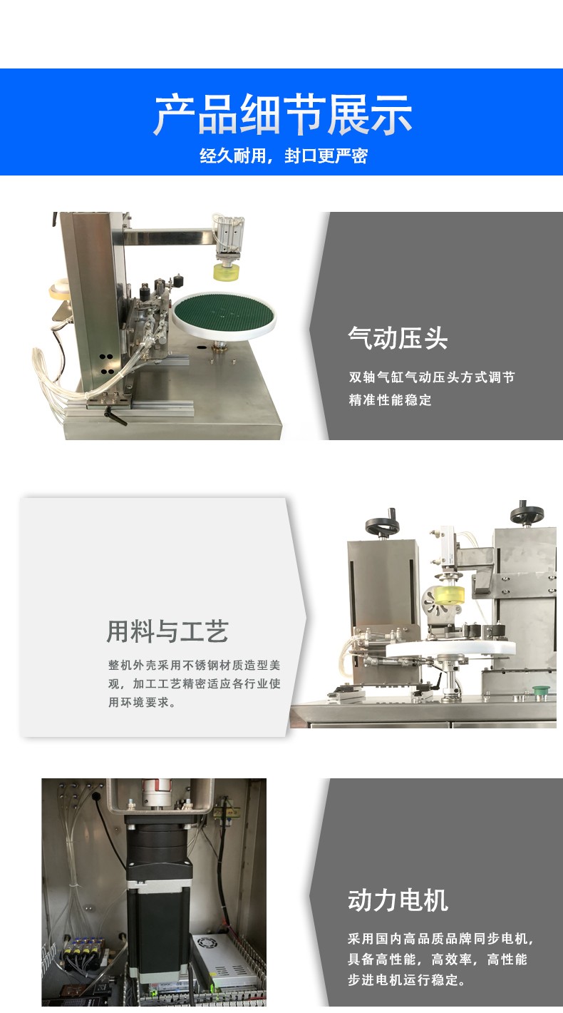 - 當罐盒被輸送到封口位置時,封口執行機構開始運作。壓帶輪首先下降,將膠帶緊密地貼合在罐盒的開口邊緣。壓帶輪的壓力是可以調節的,一般通過氣壓裝置或機械彈簧來控制。對于不同材質和厚度的膠帶,以及不同尺寸和硬度的罐盒,需要調整合適的壓力,以保證膠帶能夠牢固地粘貼在罐盒上。在壓帶輪貼合膠帶的同時,罐盒可能會在輸送帶的帶動下緩慢旋轉(對于圓形罐盒)或者沿著一定的直線方向移動(對于方形罐盒),這樣可以使膠帶均勻地圍繞罐盒開口一周,實現完整的封口。