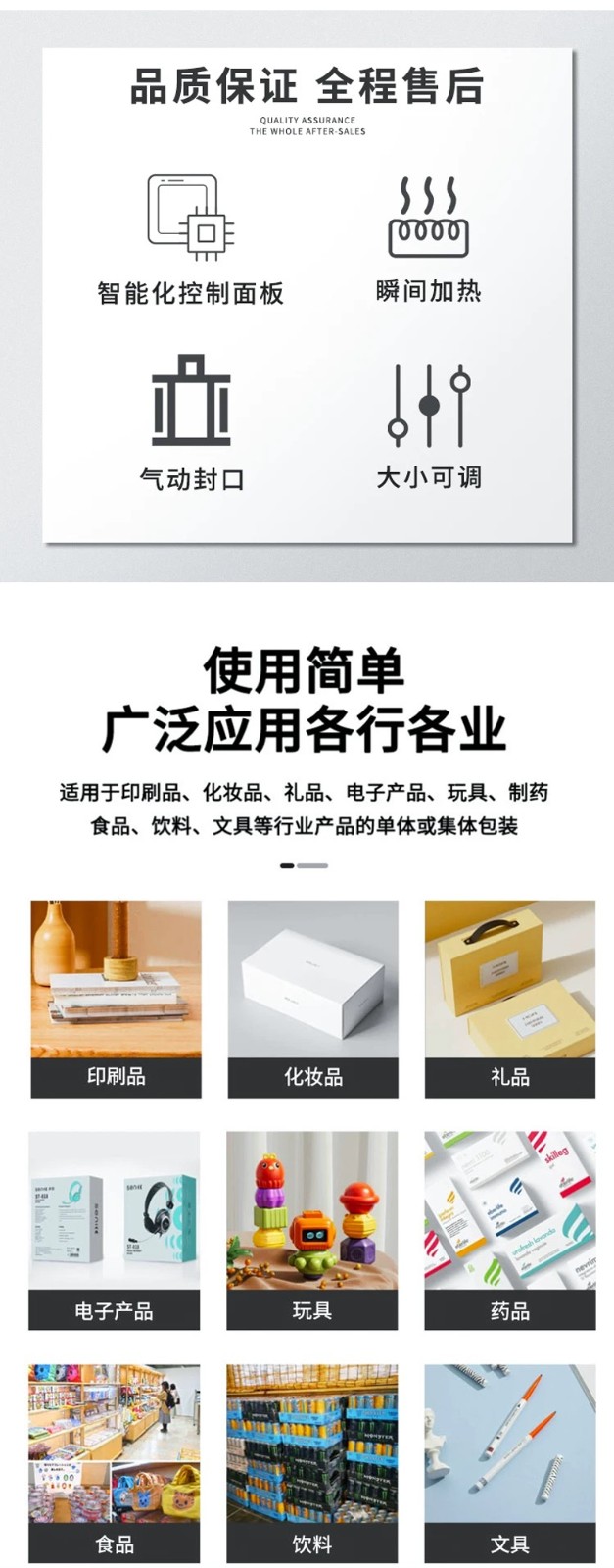 - 適應性強:可適應多種材質和規(guī)格的塑料薄膜,如 PVC、PE、PP 等,并且能夠根據不同產品的尺寸和包裝要求,調整封口長度、切角大小、熱收縮溫度和時間等參數(shù),具有較強的通用性。