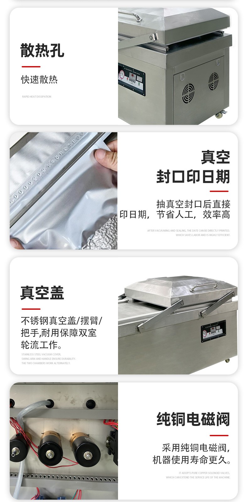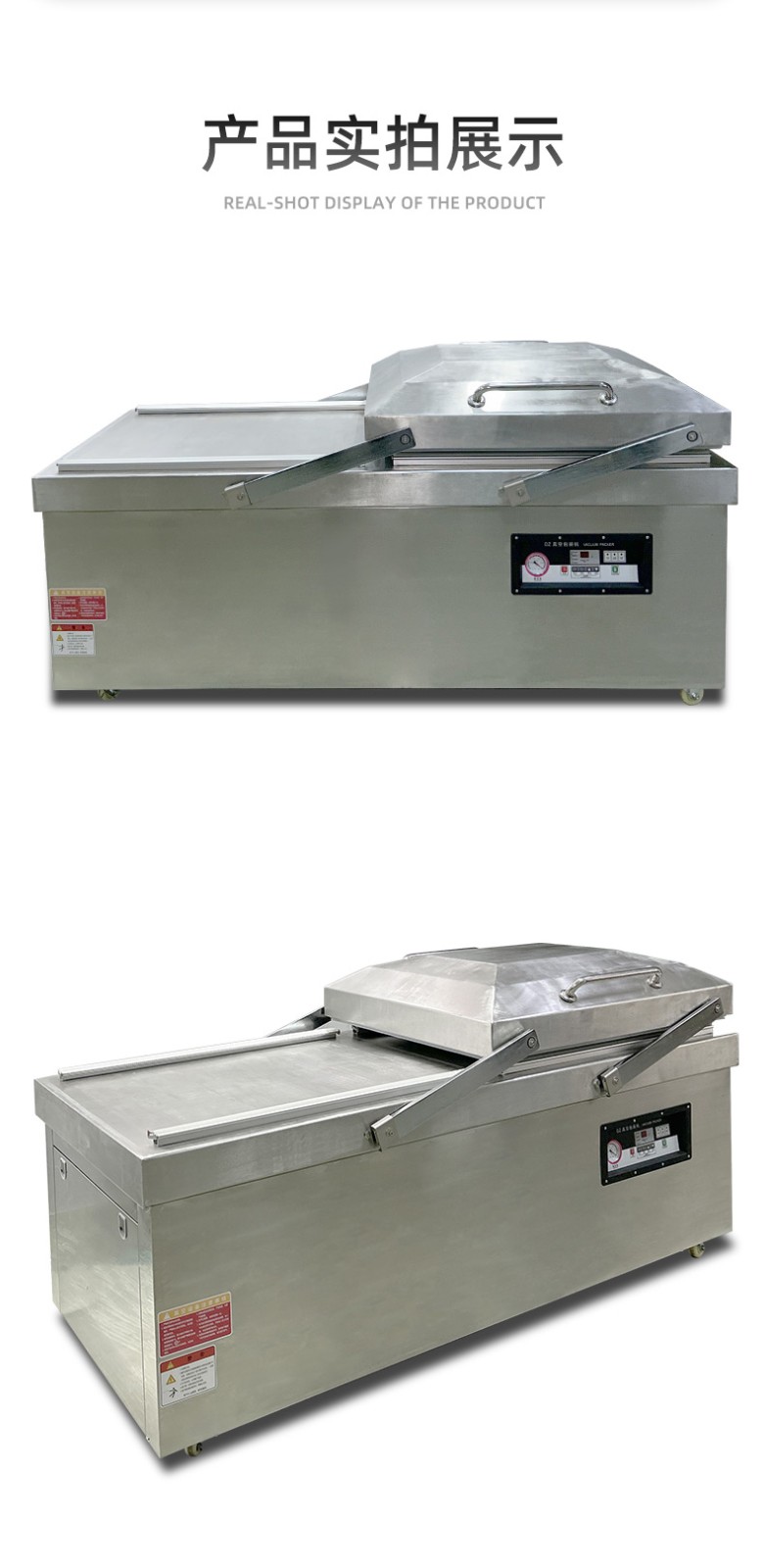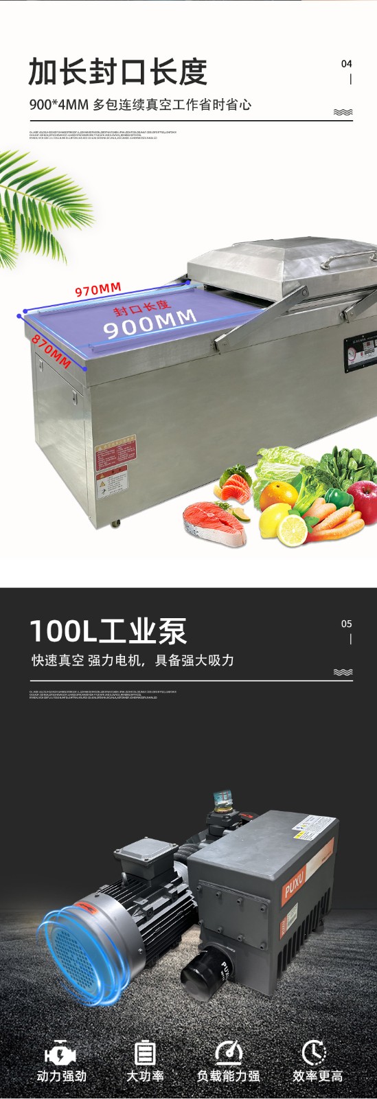 • 真空室:通常由不銹鋼制成,具有兩個對稱的工作室,可同時進行真空包裝操作,提高工作效率。工作室底部為平板狀,便于放置包裝物品,且易于清潔。