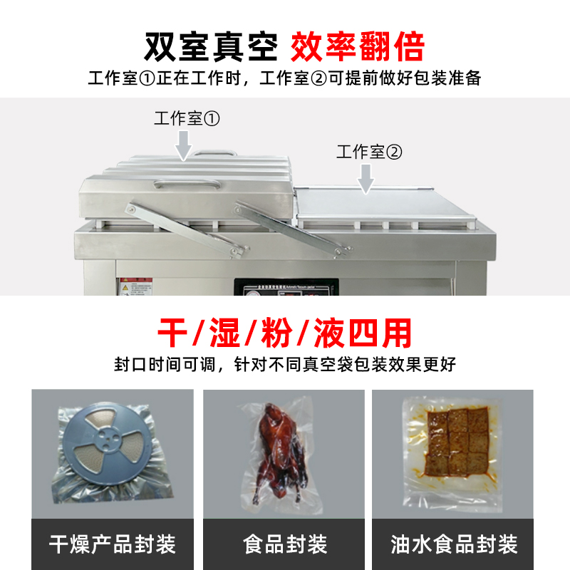 雙室真空包裝機通過 “雙真空室輪換作業” 實現抽真空與裝袋無縫銜接,核心是利用兩個獨立真空室的 “時間差并行操作”,讓設備在同一周期內同時完成 “抽真空密封” 和 “人工 / 自動裝袋”,徹底消除單室機型 “抽真空時無法裝袋” 的等待間隙,大幅提升作業效率。其具體運作邏輯和優勢可拆解為以下 3 點: