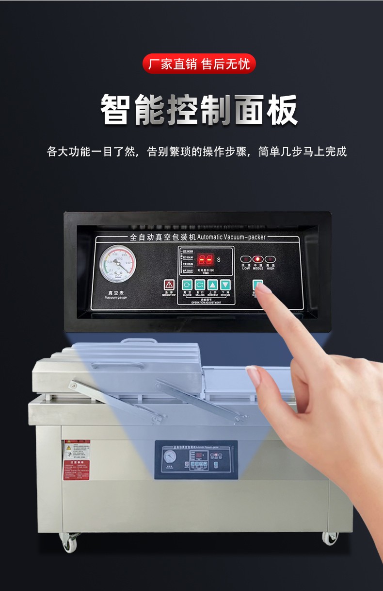 - 同一時間,右室真空蓋保持開啟,操作人員可同步將下一批待包裝產品放入右室包裝袋并擺好(即 “裝袋準備”),無需等待左室流程結束 —— 此時左室 “忙” 于抽真空密封,右室 “閑” 于裝袋,兩者并行不沖突。