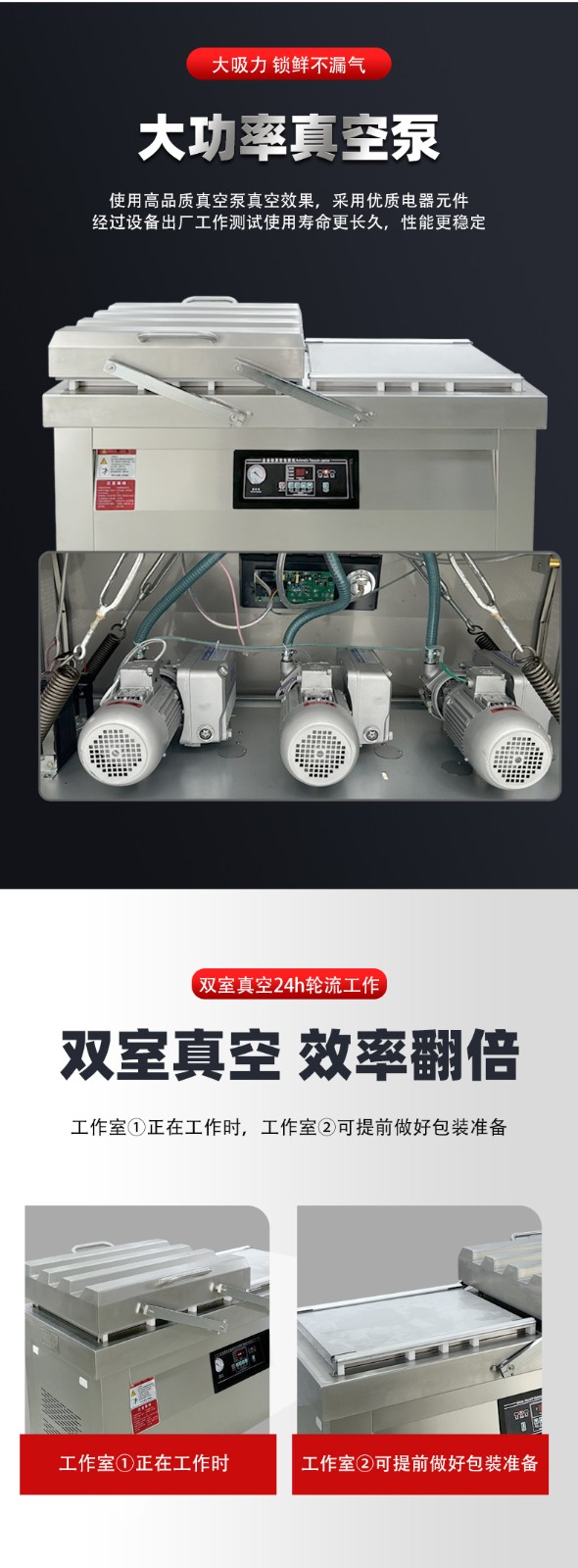 - 同時,關閉右室真空蓋,設備立即切換動力至右室,啟動右室的抽真空→熱封→冷卻→回氣流程;